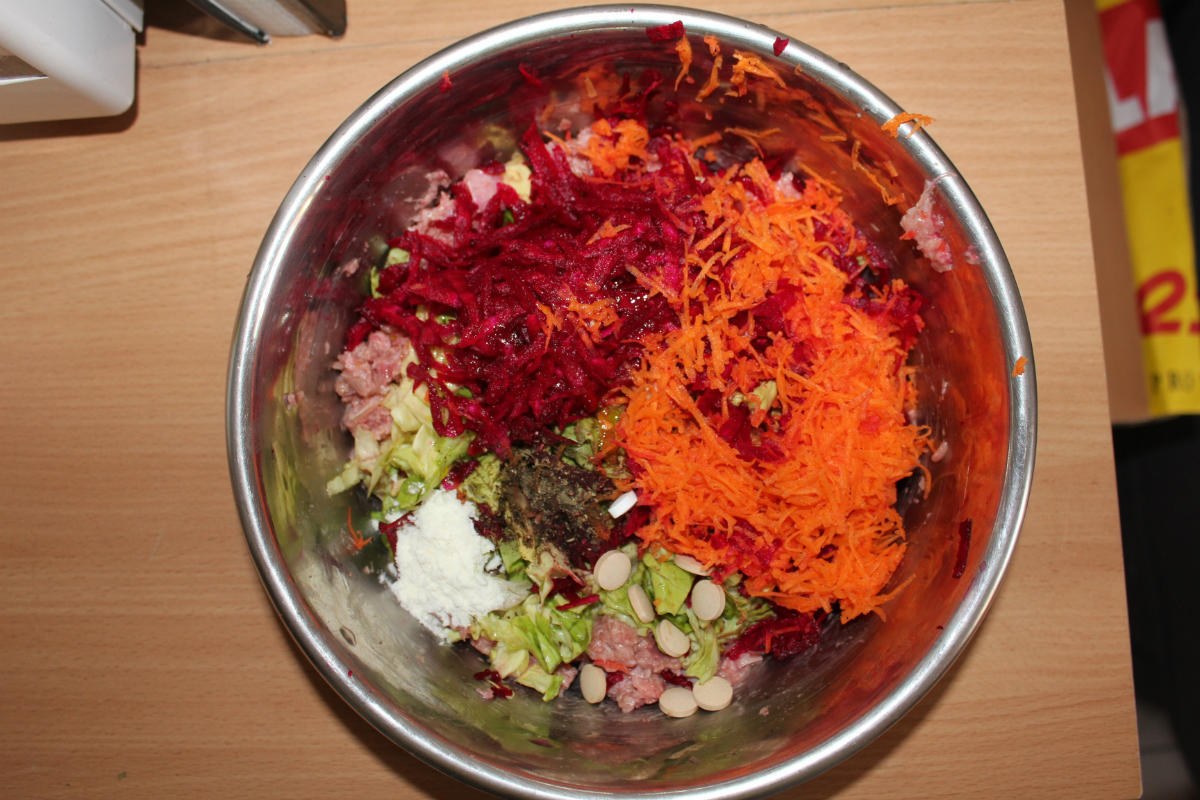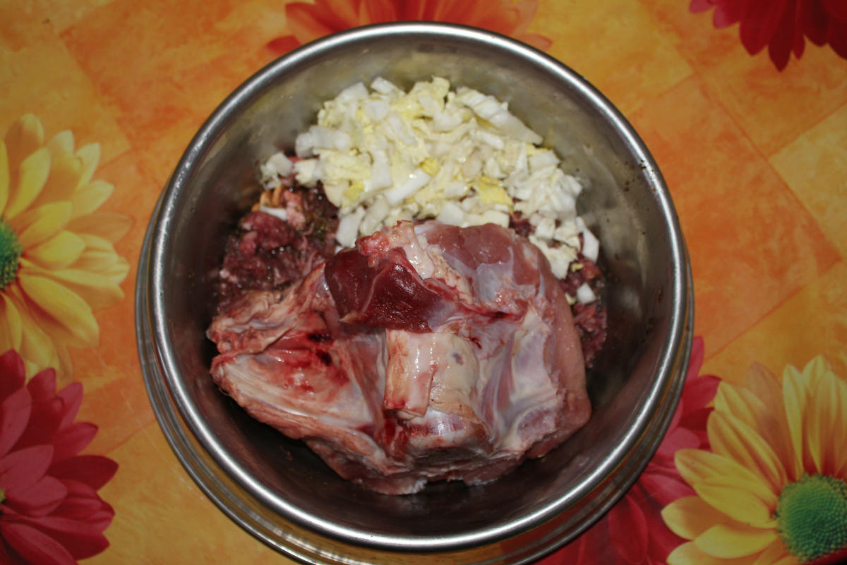 3) Telecí žebra, vepř.hrub, číns.zelí, mořs.řasy, 4) Drůbeží mleté, polní okurka, ředkvička, rajče,